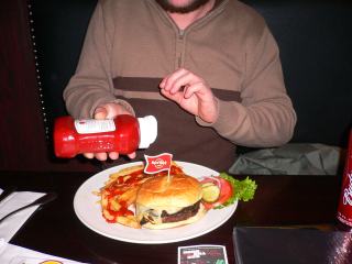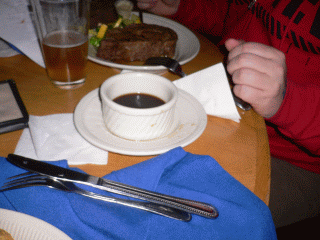 Patrick hatte inzwischen einen Tisch in einem Restaurant ganz in der Nähe seiner Wohnung bestellt. Wir sind dann erstmal zu ihm nach Hause gefahren. Auf dem Weg dorthin haben wir unsere erste Tankerfahrung gemacht. Es ging allerdings viel leichter als erwartet. Einfach Kreditkarte durchziehen, Benzinsorte wählen, tanken, Quittung nehmen und wegfahren. Da braucht man nicht zur Kasse. Einfach! Bei Patrick angekommen war sein Sohn schon ganz aufgeregt. Es ging dann gleich los ins „Deadwood”. Dort läuft ohne Vorbestellung gar nichts. Gäste nach uns haben ca. zwei Stunden auf einen Tisch gewartet. Das scheint aber normal zu sein. Ich habe BBQ Ribs gegessen (eine halbe Portion), was ausreichend war. Zu dritt haben wir noch drei pint Bier „Bell's PTR” bestellt. Es kam in einem Krug (1,5ltr) mit drei gekühlten Gläsern, hat aber gut geschmeckt.